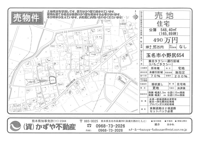 | 備考 | 水道→前面道路に水道管有 排水→前面道路に下水管有 玉名町小/玉名中校区 |