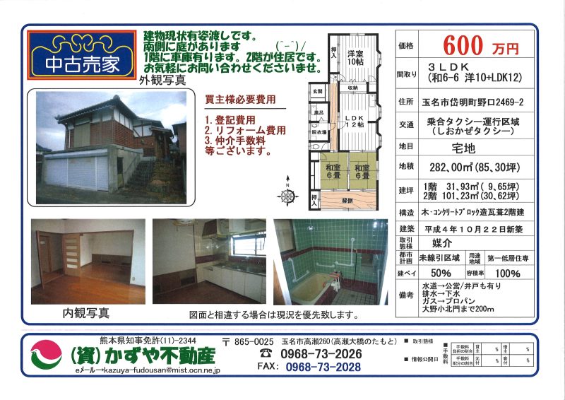 備考 | 建物現状有姿渡しです。室内荷物は撤去いたします。南側に庭があります。車庫と倉庫あります。大野小学校北門まで200m |