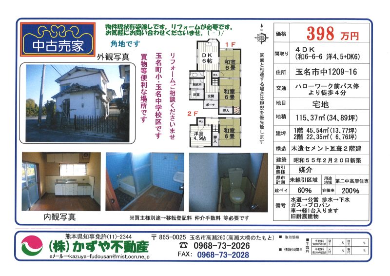 | 備考 | 水道→公営 排水→下水 ガス→プロパン 建物現状有姿渡しです。リフォームが必要です。旧耐震建物。車→軽1台入ります。玉名町小・玉名中学校区です。買物等便利な場所です。 登記費用・リフォーム費用は買主様となります。 |