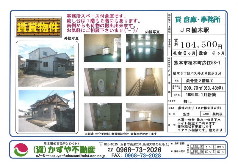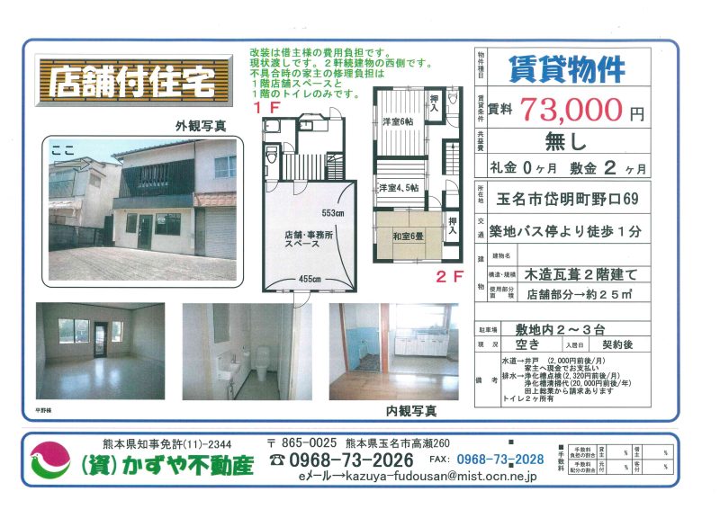 玉名衣料さんの2階部分です。裏口からも入れます。エアコン有り(使用可能)。ご希望あれば3階も相談可能です。 |