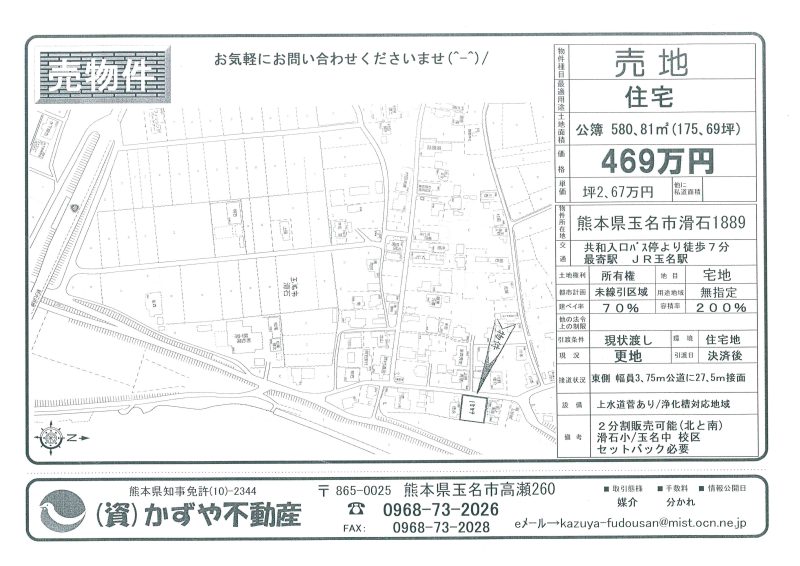 | 備考 | 北側(北と南、2区画で販売 農地転用必要 セットバック必要 ブロック有り(現状渡し) 滑石小/玉名中学校区 |