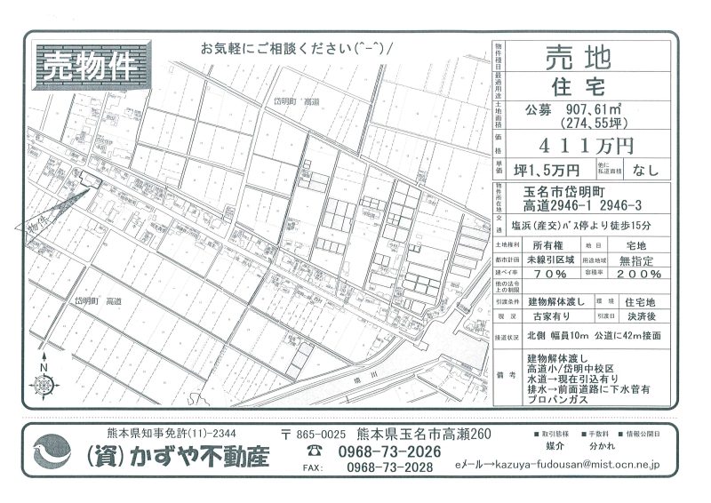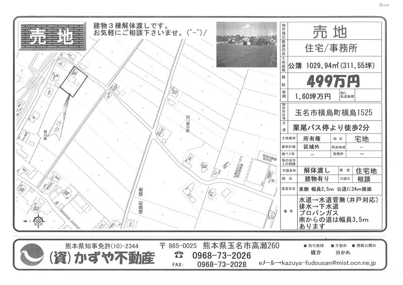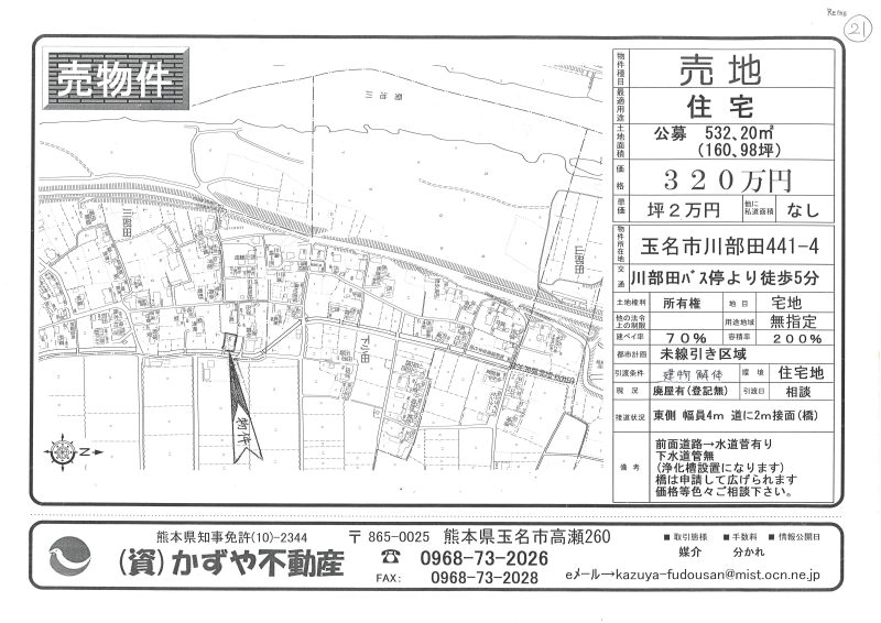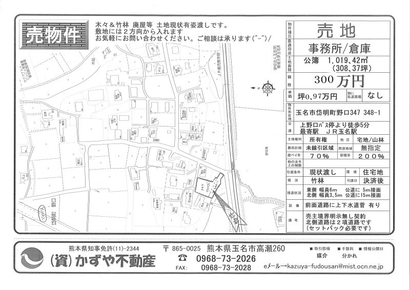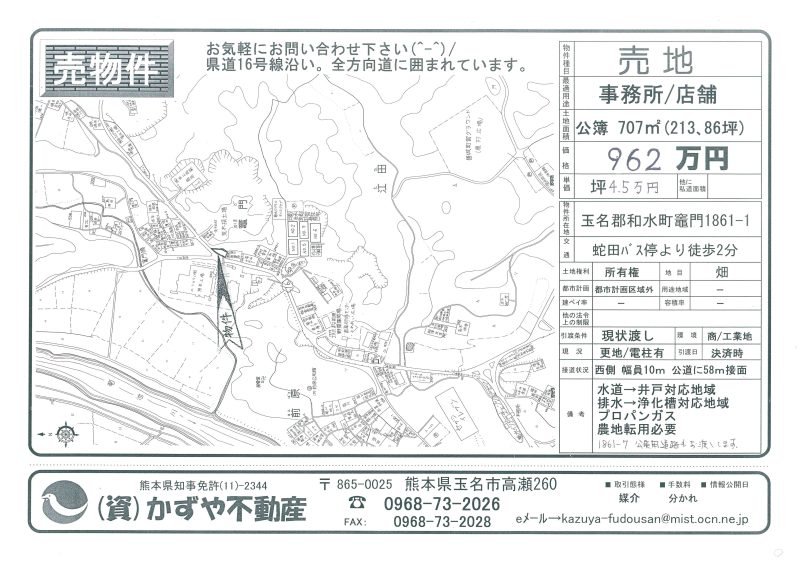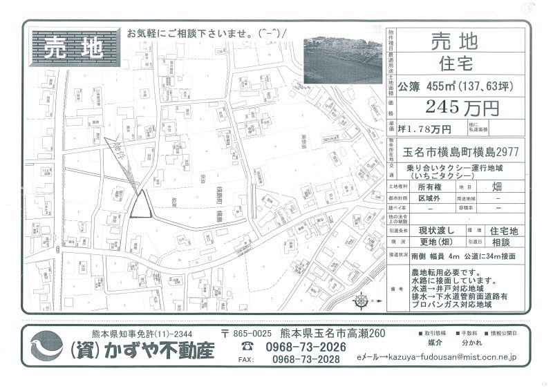 | 備考 | 水道→北側道路に水道管有 排水→北側道路に下水道管有 プロパンガス対応 買主様農地転用必要です。買主様土地造成工事必要です。和水町の便利な場所です。古家&古倉庫&木等現状有姿渡しです。アパートや事務所用地にいかがでしょうか。 |