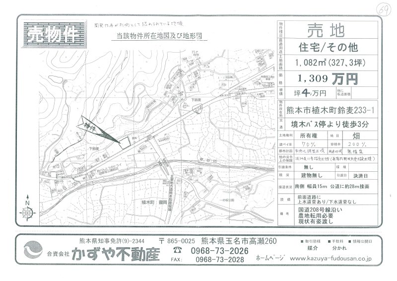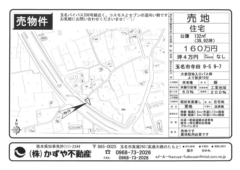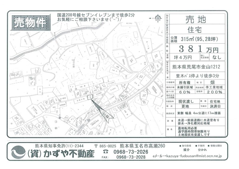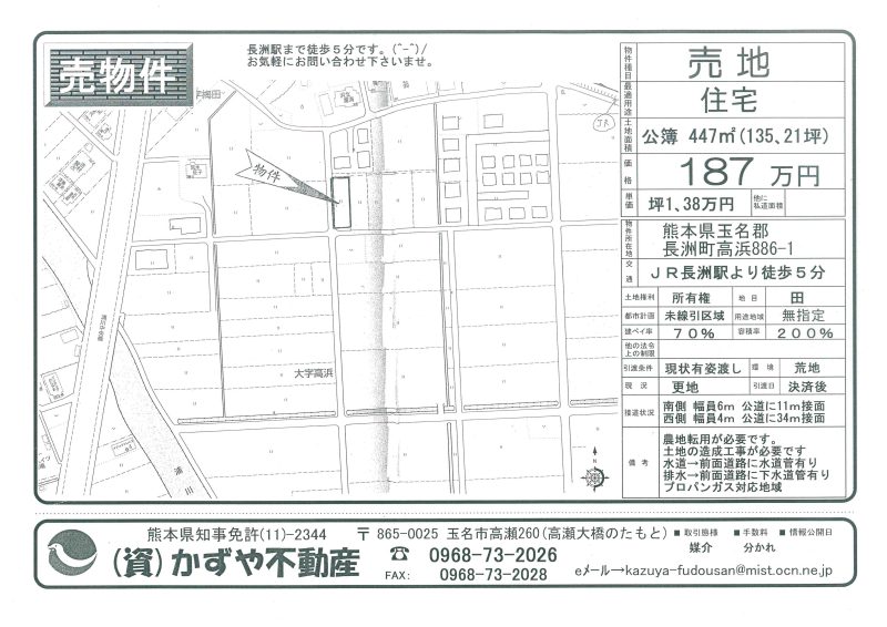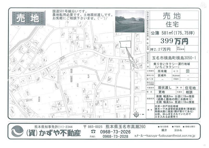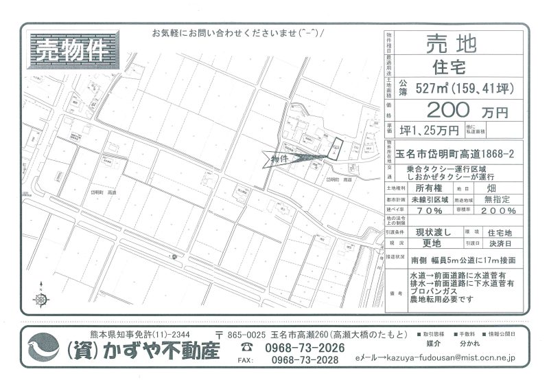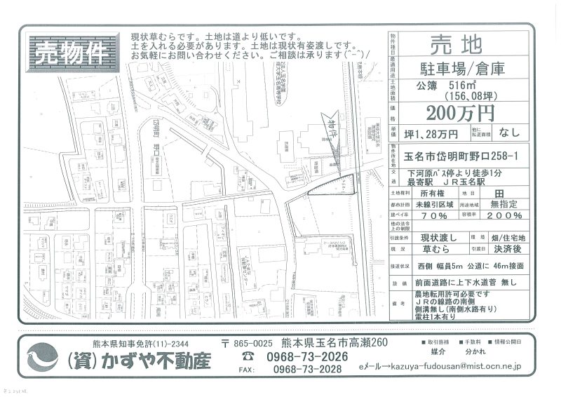 | 備考 | 玉名バイパス208号線沿い。コスモスとセブンイレブンの間です。水道→前面道路に水道管有 排水→浄化槽対応地域 プロパンガス対応地域 農地転用必要です。土を入れる必要有り。 |