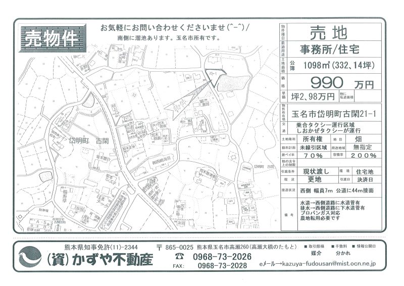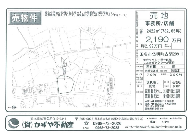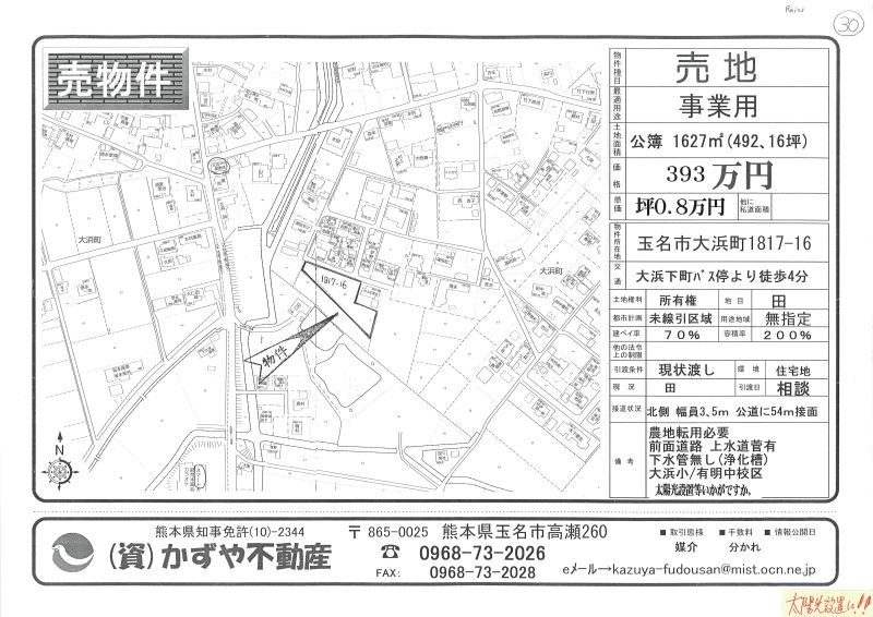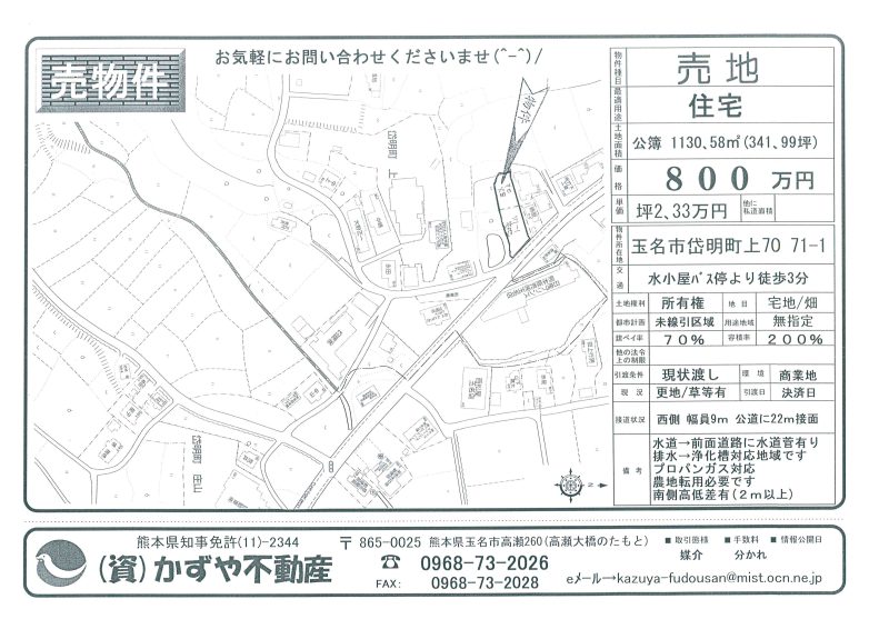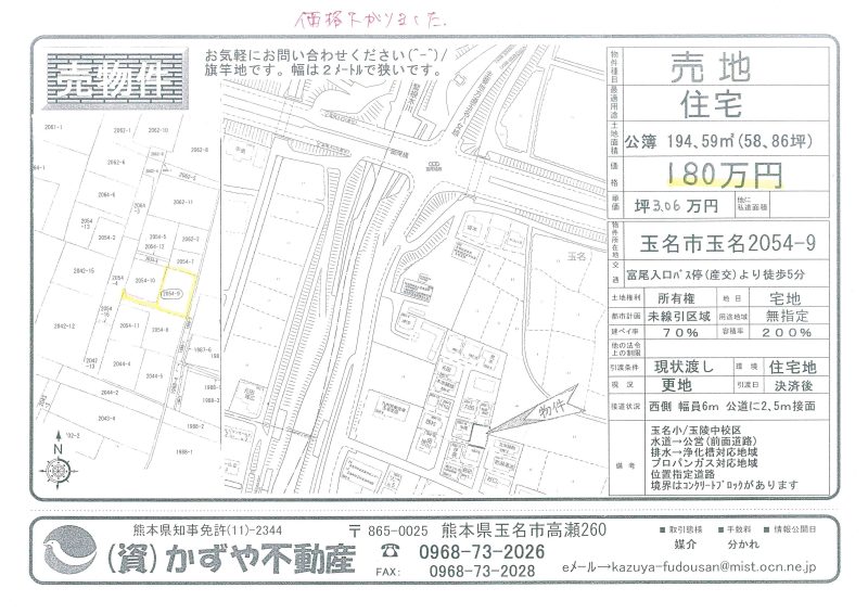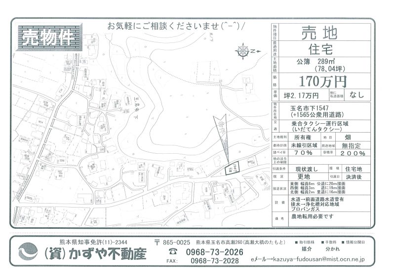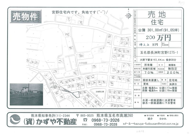 | 備考 | 玉名バイパス208号線沿い。コスモスとセブンイレブンの間です。水道→前面道路に水道管有 排水→浄化槽対応地域 プロパンガス対応地域 農地転用必要です。土を入れる必要有り。 |