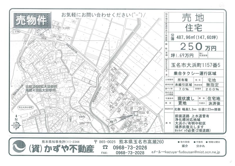 | 備考 | 水道→前面道路に水道管有 排水→前面道路に下水管有 玉名町小/玉名中校区 |