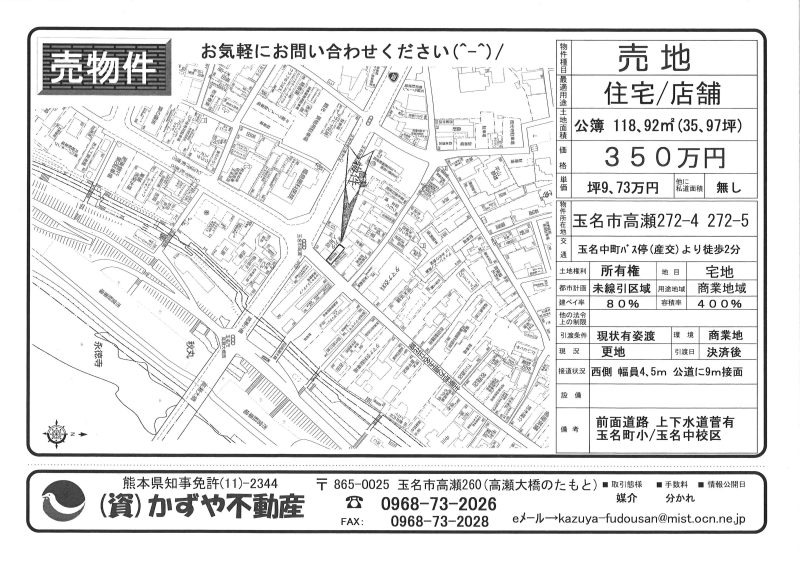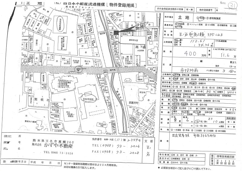 | 所在地/地目 | 熊本県玉名市高瀬字魚屋町118 宅地 |