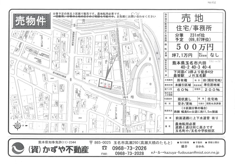 | 所在地/地目 | 熊本県玉名市六田40-2 40-3 40-4 田(現状宅地です) |