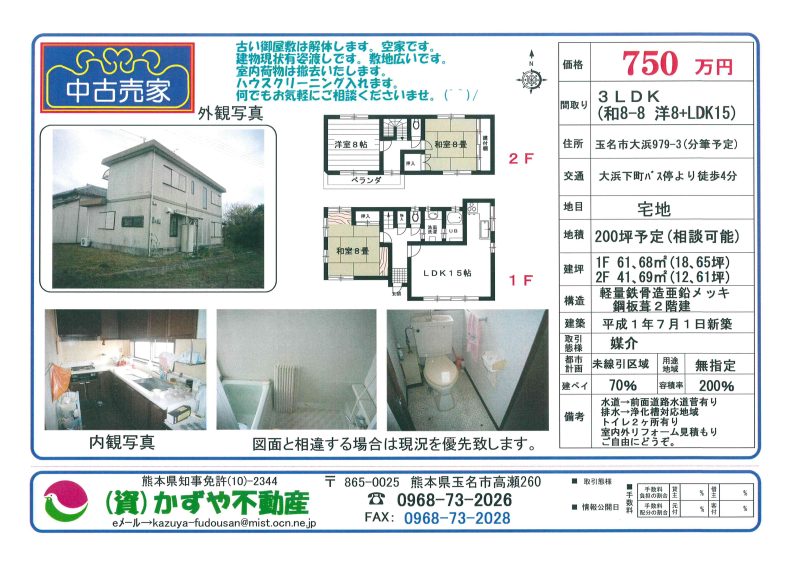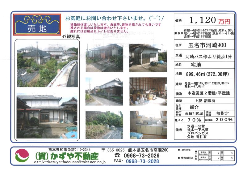 | 備考 | 水道→公営 排水→下水 ガス→プロパン 建物現状有姿渡しです。リフォームが必要です。旧耐震建物。車→軽1台入ります。玉名町小・玉名中学校区です。買物等便利な場所です。 登記費用・リフォーム費用は買主様となります。 |