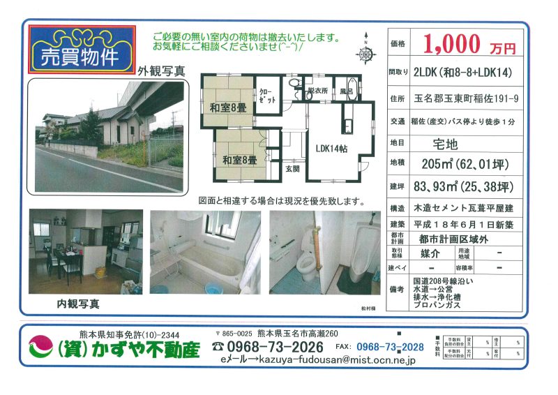 | 備考 | 水道➝公営 排水➝浄化槽。ご必要の無い室内の荷物は撤去いたします。 お気軽にお問合せください。 |