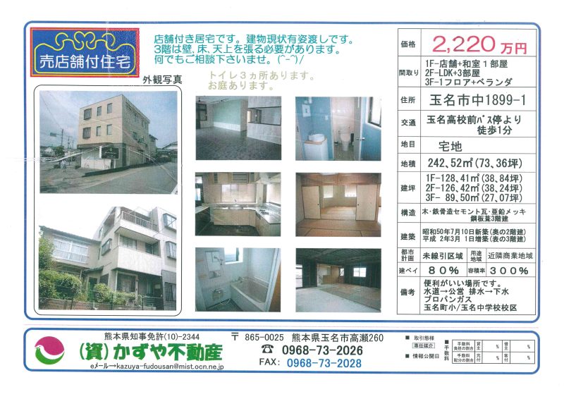 | 備考 | 水道→公営 排水→下水 プロパンガス 玉名町小/玉名中学校校区 旧耐震建物 店舗付き居宅です 境界杭復元測量入れます。トイレ2ヶ所有り 現在、営業&入居中です。申込後、荷物は撤去いたします。土地&建物は現状有姿渡しの契約です。買主様はリフォーム&お掃除等は必要です。引っ越しまで1ヶ月位お時間いただきます。 |