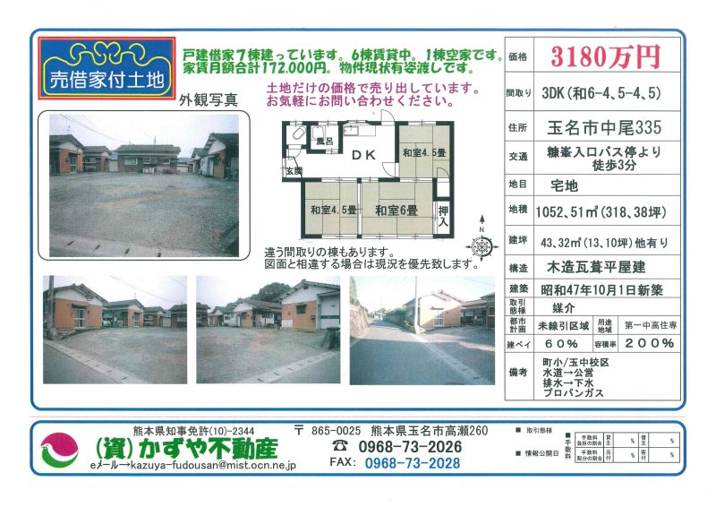 | 備考 | 戸建借家7棟建っています。6棟賃貸中。1棟空家です。家賃月額合計172,000円。物件現状有姿渡しです。土地だけの価格で売り出しています。お気軽にお問合せください。 |