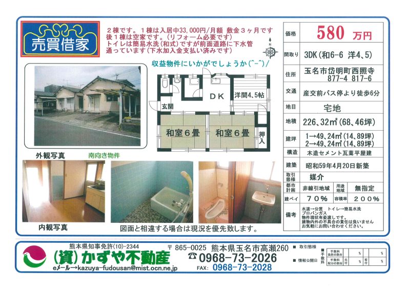 | 備考 | 水道➝公営 トイレ➝簡易水洗 プロパンガス 物件現状有姿渡しです。 建物内外の不具合の責任は負いません。2棟です。1棟は入居中33,000円/月額 敷金3ヶ月です。後1棟は空家です。(リフォーム必要です)トイレは簡易水洗(和式)ですが、前面道路に下水管通っています。(下水加入金支払い済みです) |