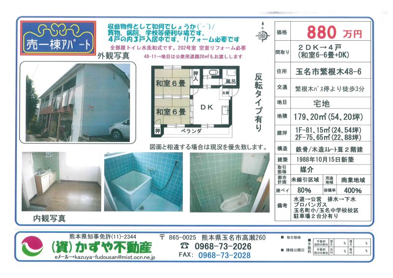 | 備考 | 水道→公営 排水→下水 プロパンガス 玉名町小/玉名中学校校区 駐車場2台分有り 全部屋トイレ水栓和式です。4戸の内、3戸入居中です。収益物件としていかがでしょうか! 202号室(空室)リフォーム必要 48-11→地目は公衆用道路20㎡もお渡しします。 |