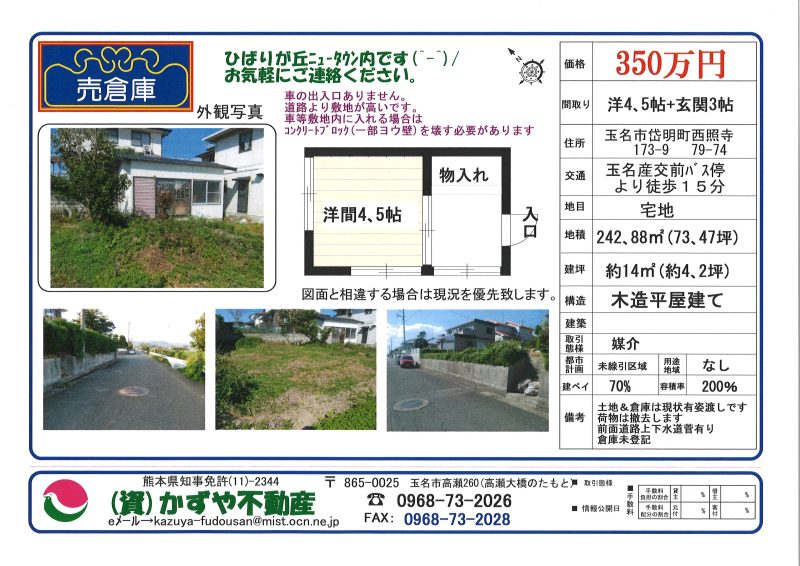 | 所在地 | 熊本県玉名市岱明町西照寺173-9 79-74 |